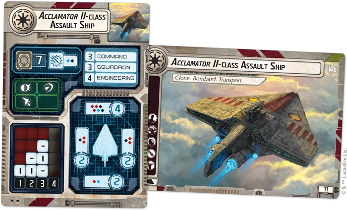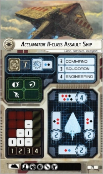 Compared to the Acclamator I-class Assault Ship for 66 pts. the II-class variant is armed with 1 additional blue die at the front and at the rear batteries with 1 blue die instead of 1 black. It has 1 blue and 1 black anti-squadron dice compared to 2 black for the cheaper variant. The II-class comes with 1 slot for Defensive Retrofit Upgrade cards instead of 2 slots for Offensive Retrofit and it shows the Bombard trait.