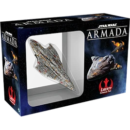 " Like the Home One, the Liberty enters Armada as a large-base ship with eight hull. However, beyond their similarities in size and hull and the fact that both ships were of Mon Calamari design, the Home One and Liberty are about as different from each other as can be. Whereas the Home One is a broadside ship with six dice in its left and right battery armaments, plus four shields each on its left, right, and forward hull zones, the Liberty is built to charge directly into battle. It features seven dice in its forward battery armament, plus five forward shields. Moreover, its upgrades are more offensive in nature than those on the Home One. "