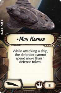 The Mon Karren was an MC80 Star Cruiser in the Solo Fleet. She appears in Solo Command, a novel in the X-Wing series, written by Aaron Allston.
