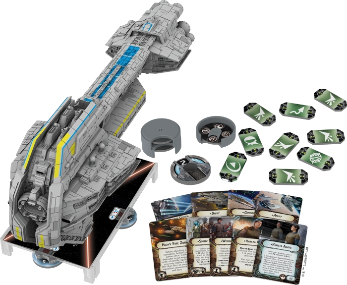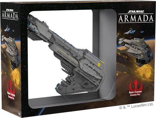 "As the largest ship in the Rebel fleet, the Nadiri Starhawk can stand against any opposing force, even the fearsome Super Star Destroyer, and the Nadiri Starhawk Expansion Pack provides you with everything you need to add this large ship to your Rebel fleet. This expansion comes complete with one ship and speed dial, four command dials, two ship cards, and fifteen possible upgrade cards, including the courageous commander Kyrsta Agate. After you deploy, Agate allows you to gain 1 non-scatter defense token, which you may discard to resolve its effect during your "Spend Defense Tokens" step, provided your speed is not 0.