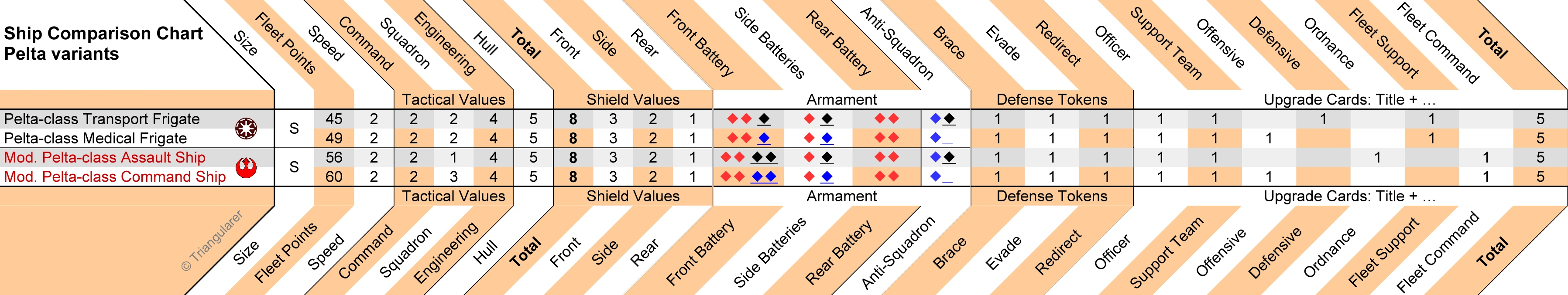 Compared to the Modified Pelta-class variants for the Rebel faction, the Republic ships lack 1 blue or black die in the front batteries. They have both no slots Fleet Support but Fleet Command upgrade cards. The Transport Frigate bears a slot for Defensive Retrofit upgrade cards instead of Ordnance, compared to the Assault Ship.