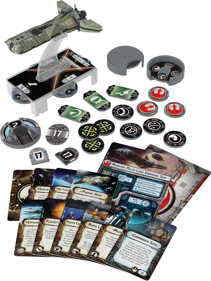 "The Phoenix Home Expansion Pack comes with one pre-painted, small-base miniature Phoenix Home, two ship cards, ten upgrade cards, and all the dials, bases, pegs, and tokens you need to use this ship to lead your growing Rebellion."