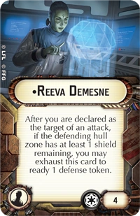 "After you are declared as the target of an attack, if the defending hull zone has at least 1 shield remaining, you may exhaust this card to ready 1 defense token."