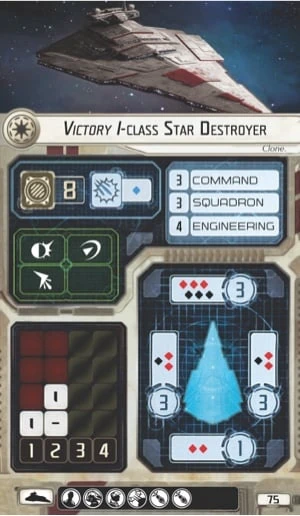 Compared to the Victory I-class Star Destroyer for 73 FP in the Imperial Fleet the Republic version bears a Salvo instead of a second Redirect defense token. It lacks the slots for a Turbolaser upgrade, instead it has a Support Team and a second Ordnance slot. It also comes with the Clone ship trait.